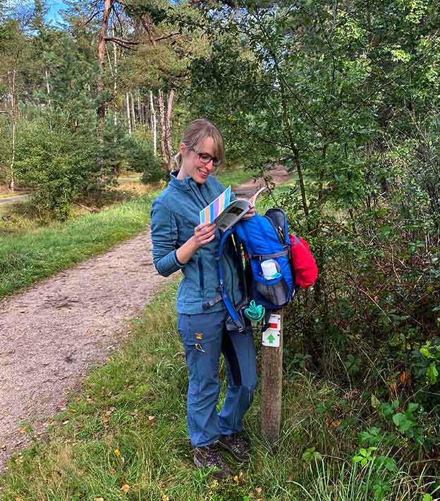 Op de kaarten in de gids kun je precies zien waar de route onverhard is (wit/rode stippellijn) of verhard (doorgetrokken rode lijn). De locaties van voorzieningen zoals bushaltes en treinstations vind je ook terug op de kaart. Ook wegwijzers en ANWB-paddenstoelen zijn voor een gemakkelijke oriëntatie met hun nummer ingetekend op de kaart.