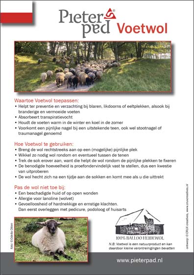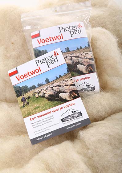 Voetwol werkt druk ontlastend voor je voeten. Gebruik het ter preventie van blaren of om gevoelige plekken te ontlasten. De Pieterpad-Voetwol is afkomstig van schapen van de herders van Balloo, die grazen langs het Pieterpad .