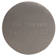 Je kunt de penning laten graveren met een tekst naar keuze. Als je geen gravering wil kies dan het artikel Penning zonder gravering